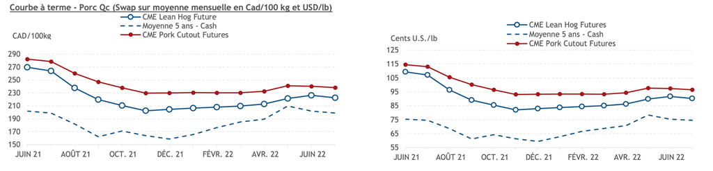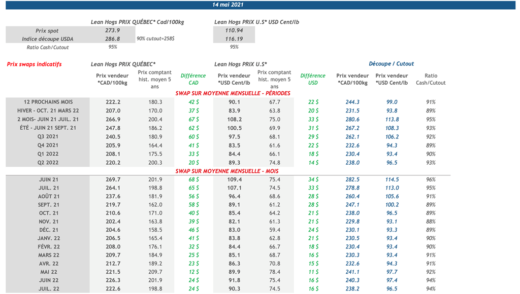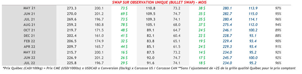 • Les contrats de porc ont tous terminé dans le rouge hier à la suite des ventes nettes d’exportation U.S. insatisfaisantes. Les contrats se sont repliés dans l’ensemble de plus de 1 US cent/lb, sauf le contrat de mai qui venait à échéance. La chute de prix a été plus prononcée pour les contrats de juin à août 2021, perdant chacun tout près de 2 US cents/lb.