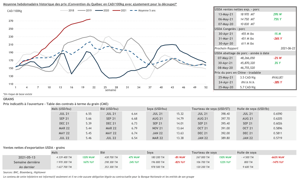 • 27 mai : USDA — Ventes nettes d’exportations pour les grains et le porc