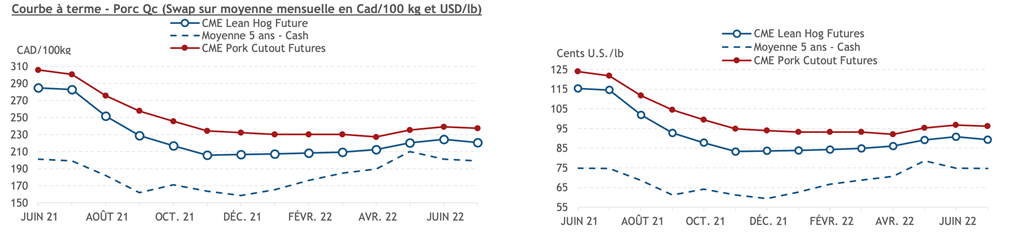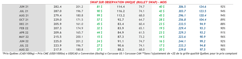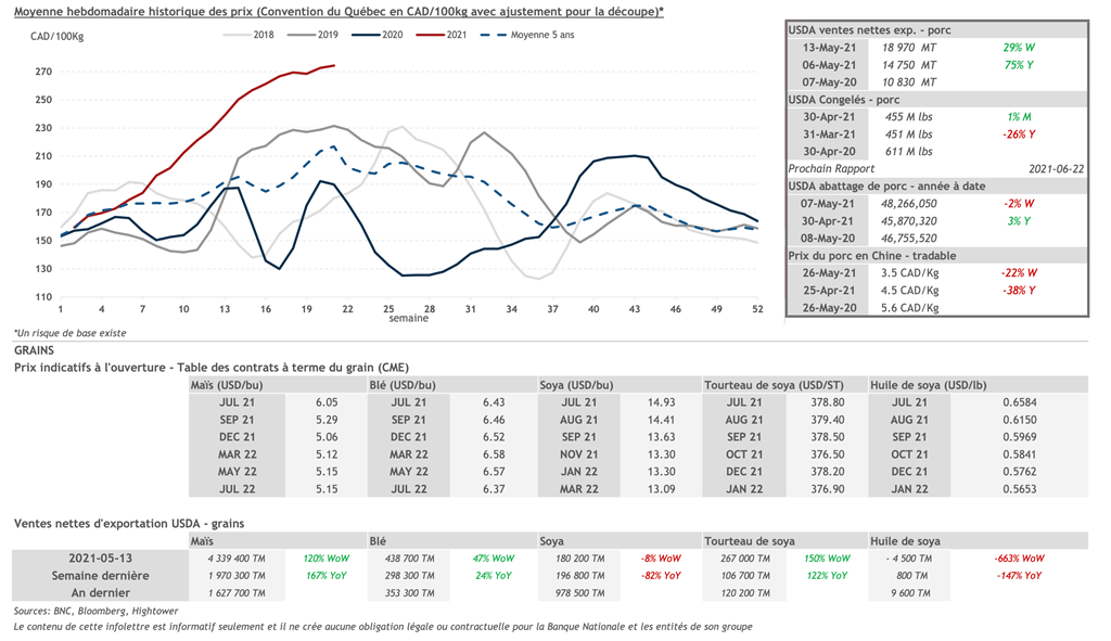 • Les contrats de porc ont terminé la journée en hausse pour les échéances de juin 2021 à mai 2022. Les échéances à court terme ont rattrapé les pertes de lundi et les contrats de juillet et août 2021 ont terminé avec des gains supérieurs à 2 cents US/lb. La tendance haussière des prix du porc se poursuit alors que les É.-U. continuent de déconfiner et que le BBQ se prête à la température estivale.