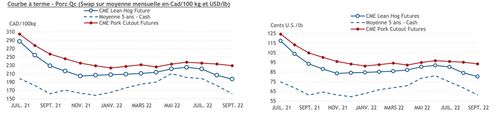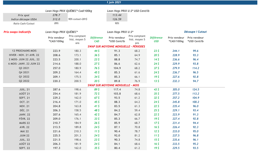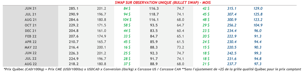 • Les contrats de porc ont tous terminé dans le vert vendredi alors que la demande en porc aux É.-U. demeure soutenue. Le contrat de juillet 2021 a clôturé à 119,350 cents US/lb avec un gain de 2,650 cents US/lb. Le contrat d’août 2021 a également fait un gain supérieur à 2 cents US/lb et a fini la semaine à 116,225 cents US/lb.
