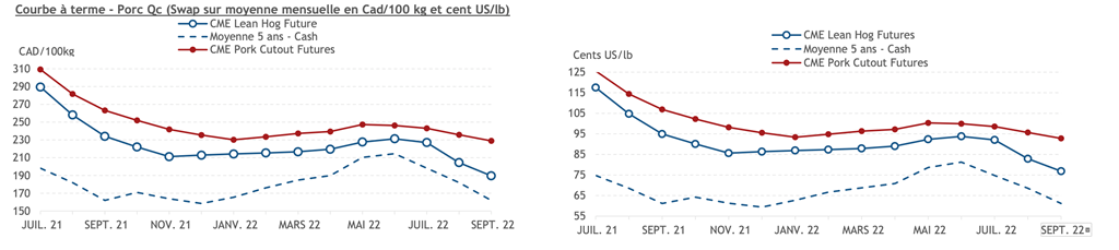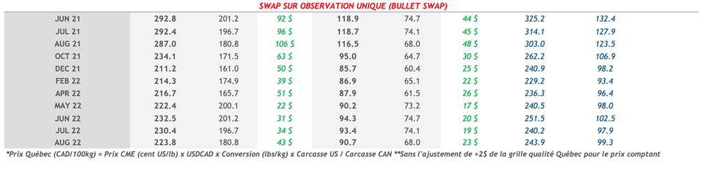 • Les contrats de porc étaient en hausse pour toutes les échéances hier. Les contrats de juin, octobre et décembre 2021 ainsi que le contrat d’août 2022 ont tous fait des gains supérieurs à 1 cent US/lb.