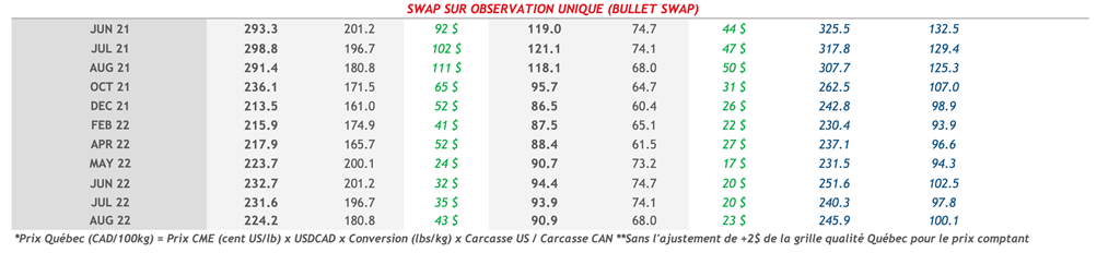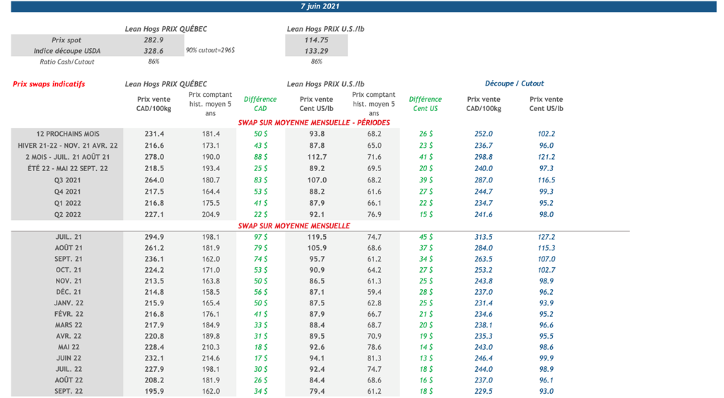 • Les contrats de porc étaient en hausse vendredi pour une deuxième journée consécutive, atteignant un nouveau sommet en 7 ans. Les contrats ont fait des gains inférieurs à 1 cent US/lb à l’exception du contrat de juillet 2021 qui a terminé la journée à 120,60 cents US/lb avec un gain de 1,60 cent US/lb. La demande pour la viande de porc aux É.-U. reste vive et continue de réduire les approvisionnements.