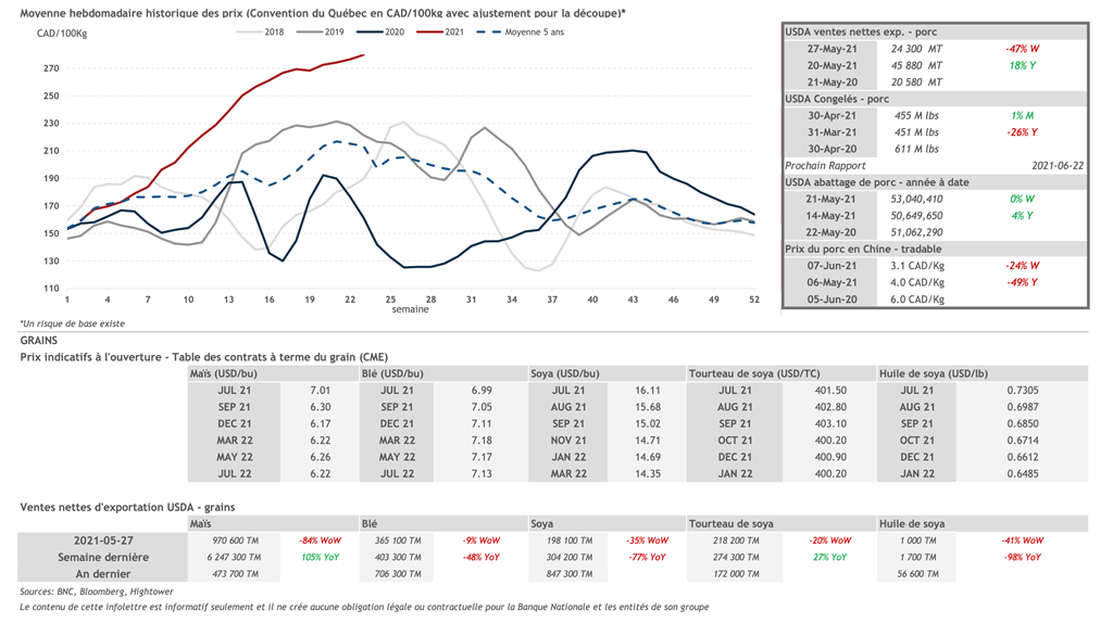 • 10 juin : USDA — Ventes nettes d’exportations pour les grains et le porc