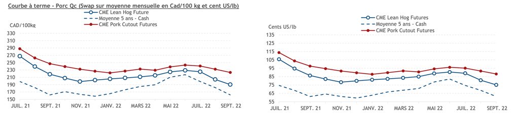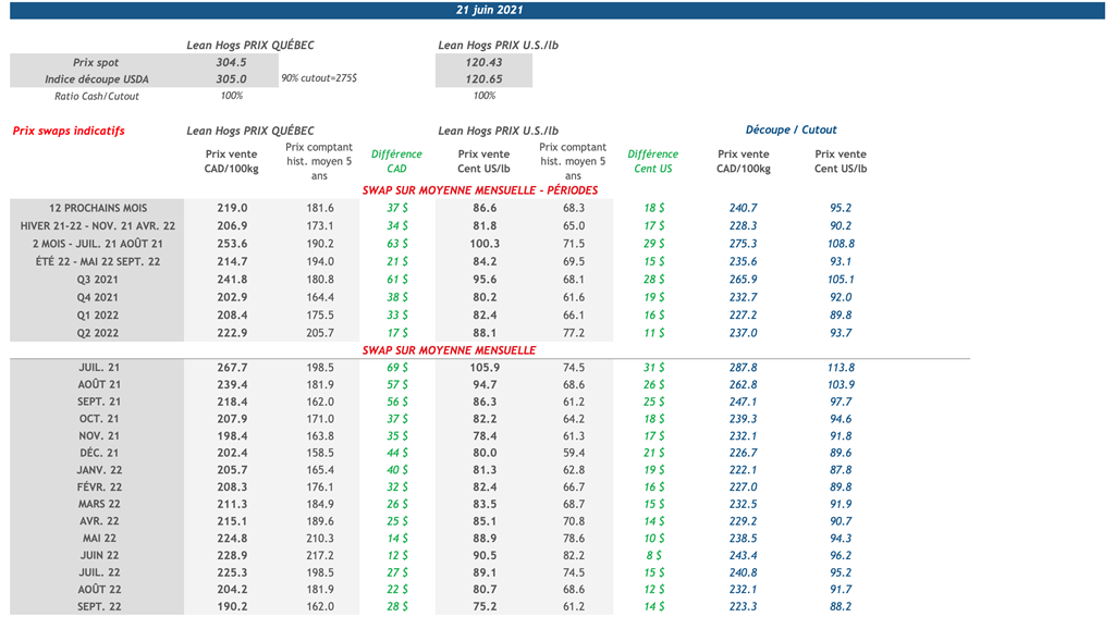 • Les contrats de porc ont repris un peu de force vendredi avec les échéances d’octobre 2021 à août 2022 terminant la journée en hausse. Cependant, ces gains sont loin d’être suffisants pour rattraper le terrain perdu. À titre d’exemple, le contrat de juillet 2021 a perdu 2,325 cents US/lb vendredi, ce qui amène la perte à 11,30 cents US/lb depuis le vendredi 11 juin. Les contrats d’août et d’octobre 2021 n’ont pas fait meilleure figure au cours de la même période avec des pertes de 10,30 et 8,50 cents US/lb respectivement.