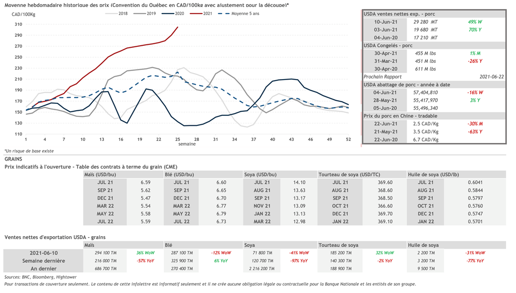 • 24 juin : USDA — Ventes nettes d’exportations pour les grains et le porc