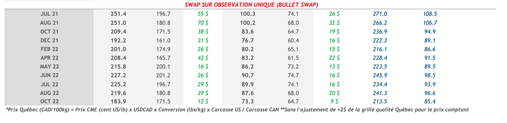 • Les contrats de porc ont commencé la journée dans le rouge hier. Les prix de certaines échéances sont remontés au fil de la session boursière, mais les contrats rapprochés se sont dépréciés de manière marquée. Le contrat de juillet 2021 a terminé à 100,025 cents US/lb avec une perte de 4,50 cents US/lb, soit le « limit-down ». Le contrat le plus actif (août 2021) a clôturé à 98,70 cents US/lb (-2,025 cents US/lb), sous le niveau de 100 cents US/lb pour la première fois depuis le mois d’avril.