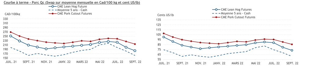 • Après une perte de près de 13 cents US/lb mardi, l’indice de la découpe de porc U.S. est demeuré pratiquement inchangé mercredi et a remonté à 112,99 cents US/lb (+5,17 cents US/lb) hier après-midi. L’indice cash CME est passé sous les 120 cents US/lb hier et s’est établi à 117,62 cents US/lb ce matin (-1,97 cent US/lb).