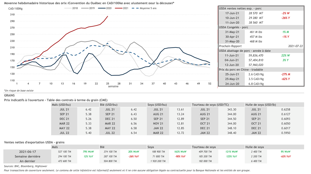 • Le rapport Hogs and Pigs de l’USDA a montré que le cheptel porcin U.S. était en hausse dans toutes les catégories (truies, porcs destinés au marché, etc.) en date du 1er juin 2021 comparativement comparativement chiffres de T1-2021 présentés dans le rapport de mars 2021.