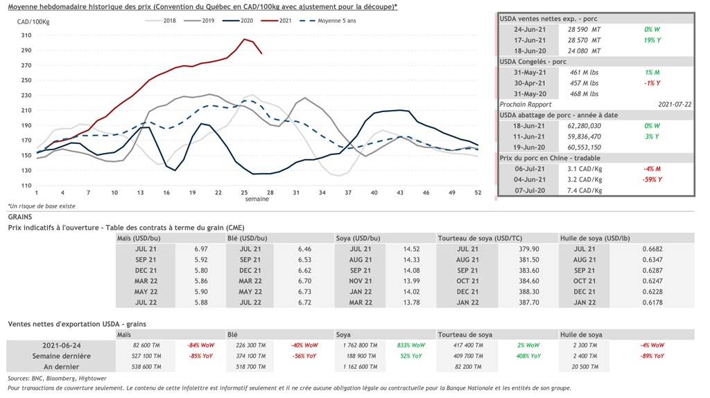 • Les contrats de porcs ont terminé la semaine en hausse vendredi dernier, à l'exception des échéances d'août et d'octobre 2021. Les prix contrats plus rapprochés demeurent cependant en dessous des sommets de juin.