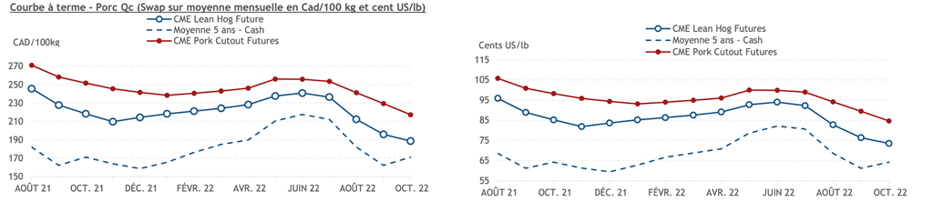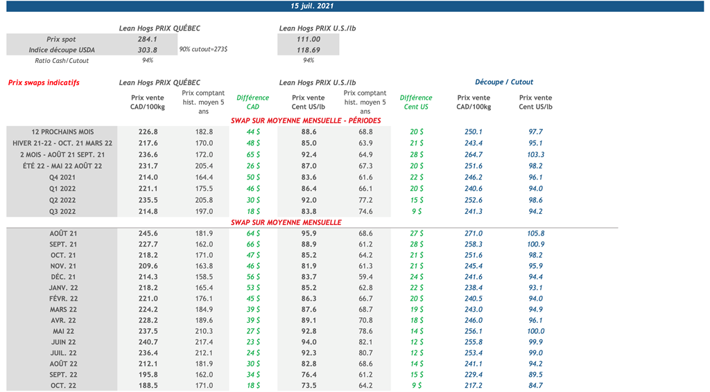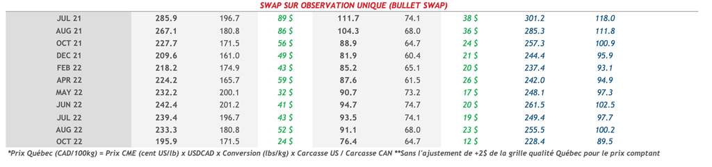• Une majorité des échéances des contrats de porc ont fait des pertes hier. Le contrat de août 2021 qui était à la hausse depuis le début de la semaine a enregistré une perte de 0,825 cents US/lb hier, pour conclure la journée à 105,100 cents US/lb.