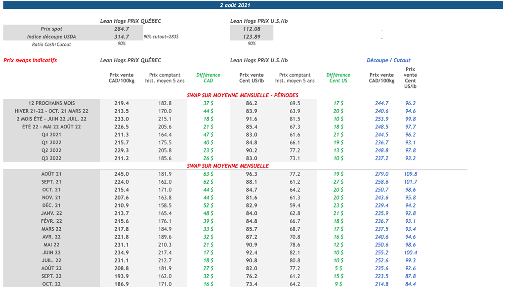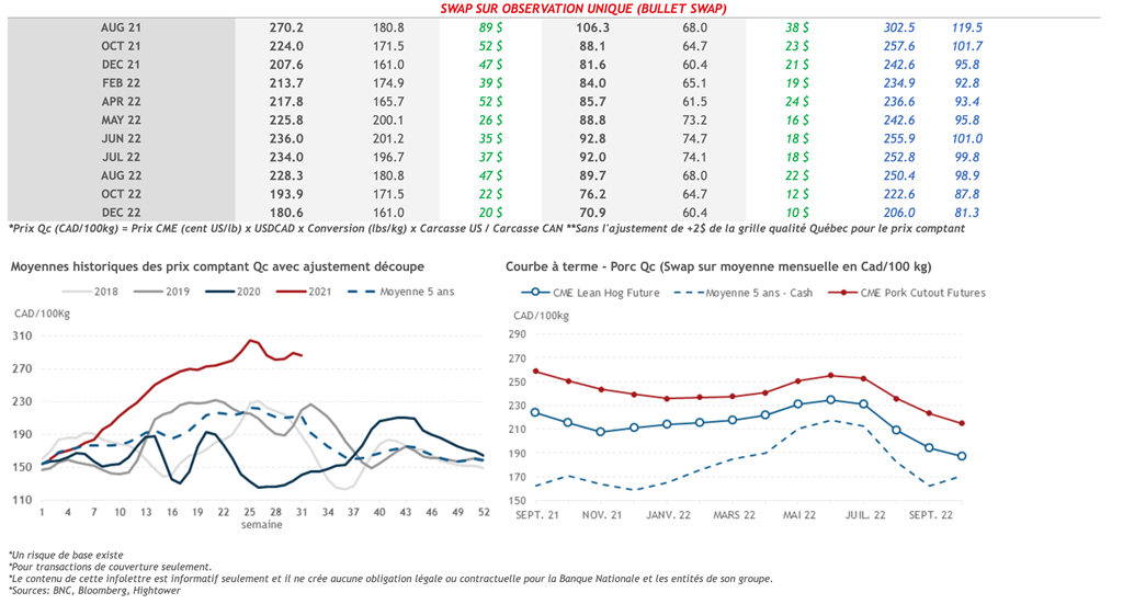 • Les échéances sur les contrats de porcs ont connu une journée dans le rouge vendredi dernier, avec des pertes allant de -0,100 à -1,125 cents US/lb. Les échéances plus éloignées sont celles qui ont connu une journée plus baissière, par exemple, octobre et décembre 2022 en baisse de 1,125 cents US/lb.