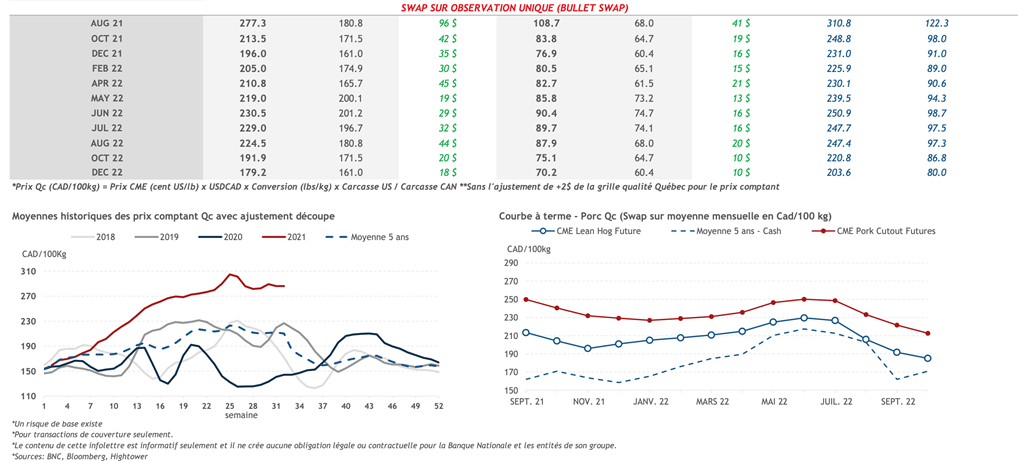 • Une autre journée dans le rouge pour la plupart des échéances, à l'exception du contrat d'août 2021, avec les craintes d'un ralentissement des exportations de porc vers la Chine et d'un fléchissement de la demande des consommateurs américains. Le contrat de fév.-22 est celui qui s'est le plus déprécié avec une perte de 1,350 cents US/lb pour conclure la journée à 81,300 cents US/lb, suivi des contrats de déc-21 et d'avril et juin-22 qui ont enregistré des pertes dépassant les 1 cent US/lb.