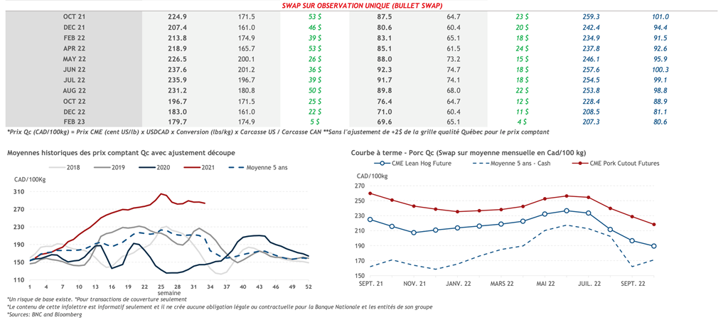 • La grande majorité des contrats de porc ont terminé la journée d’hier dans le vert à l'exception des contrats plus éloignés (déc-22 et fév-23).