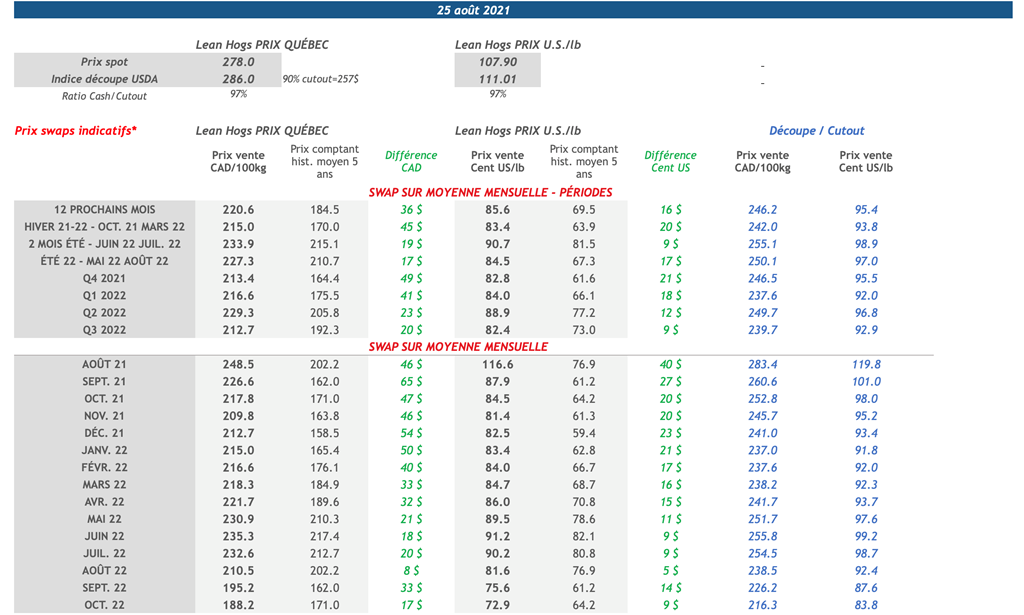 • L’indice de la découpe de porc U.S. a continué sa pente descendante avec une perte de 2,25 cents US/lb et s'est établi à 111,01 cents US/lb. L'indice CME du porc cash demeure inchangé à 107.90 cents US/lb.