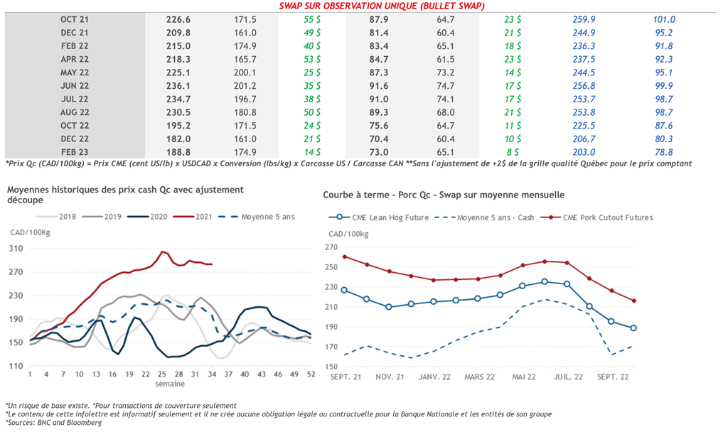 • L’ensemble des contrats de porc était dans le rouge hier. Les échéances à moyen terme (février à octobre 2022) sont celles qui se sont repliées le plus avec des pertes allant de 1,075 à 1,400 cents US/lb.
