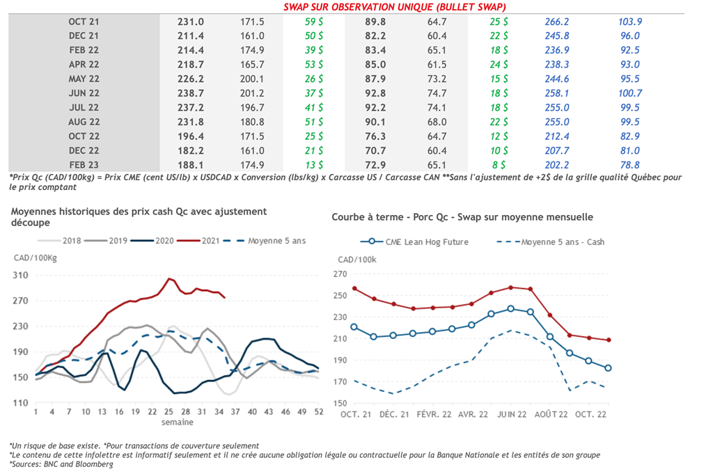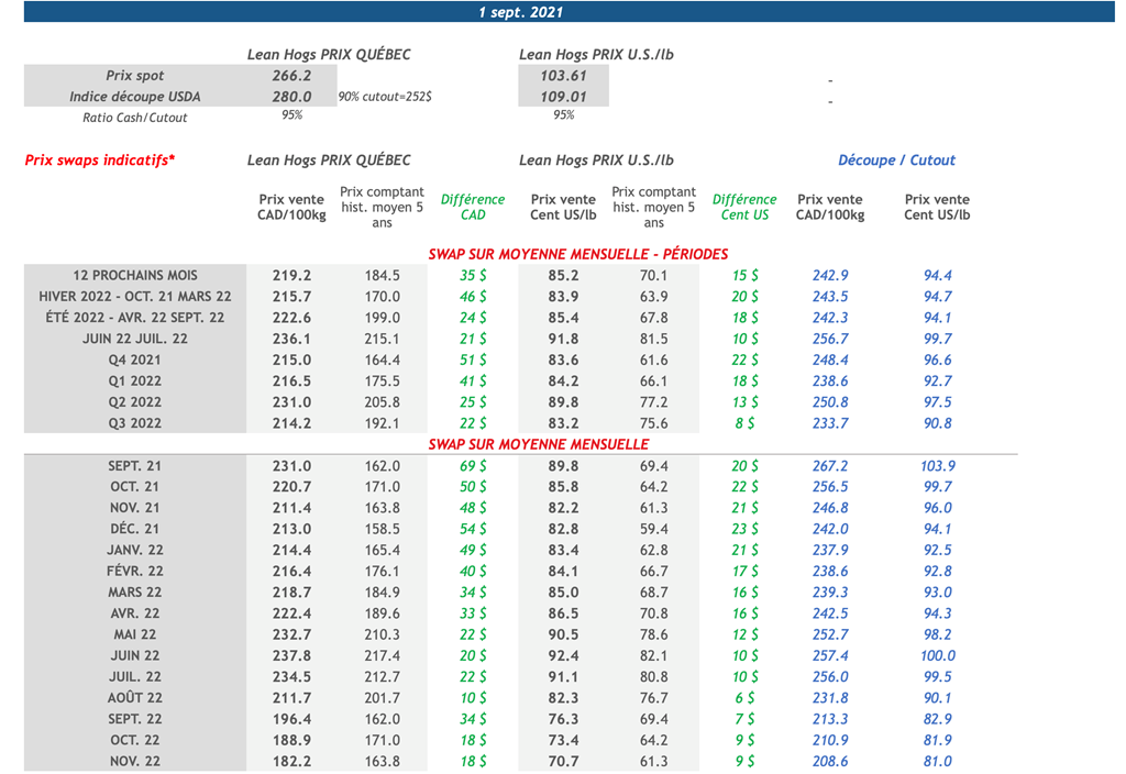 • Hier, les contrats de porc à échéance rapprochée (octobre 2021 à mai 2022) ont chuté tandis que les autres échéances faisaient des gains. Le contrat d’octobre 2021 s'est déprécié le plus avec une perte de 1,350 cent US/lb.
