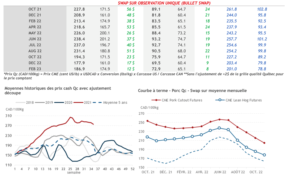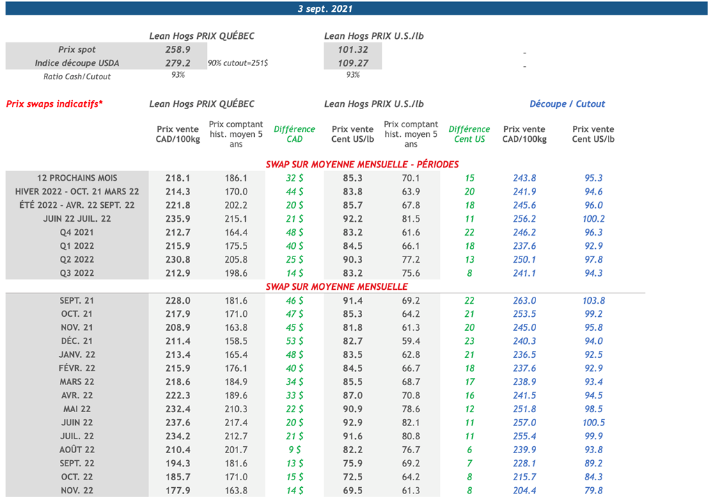 • Les contrats de porc ont fait des gains hier, à l’exception des deux contrats à échéances plus rapprochées (octobre et décembre 2021). Les gains étaient concentrés dans une fourchette de prix de 0,225 à 0,800 cent US/lb.