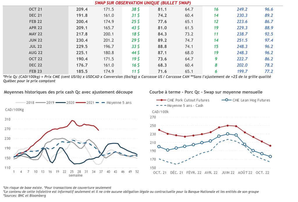 • Vendredi dernier, tous les contrats de porc ont enregistré des pertes. Les contrats d'octobre 2021 à février 2022 se sont repliés de plus de 3 cents US/lb.