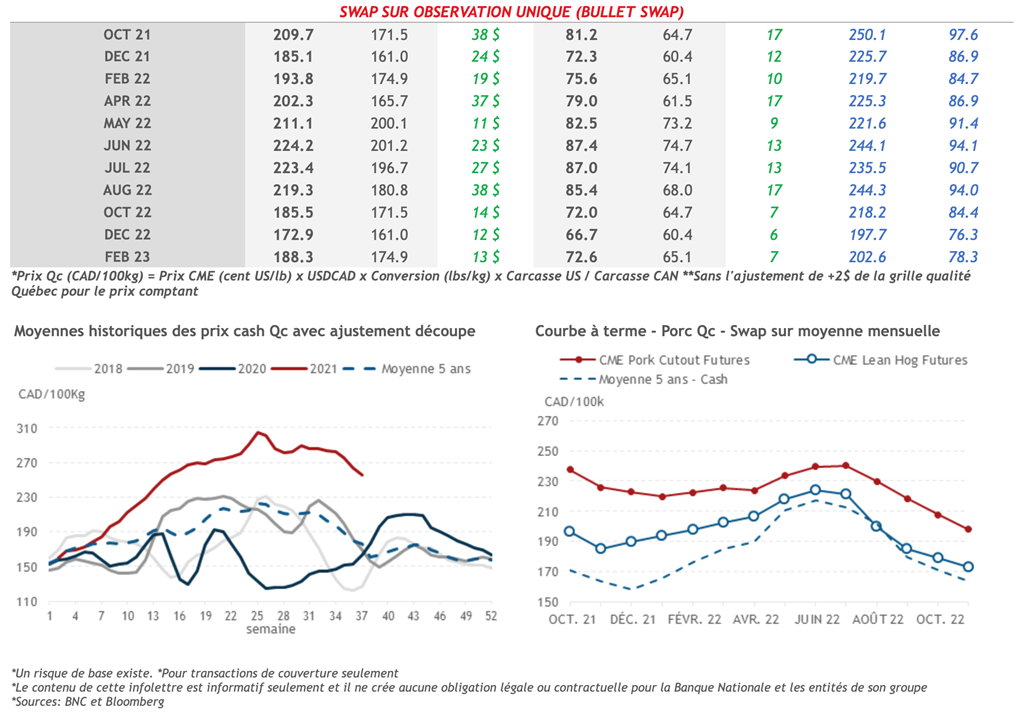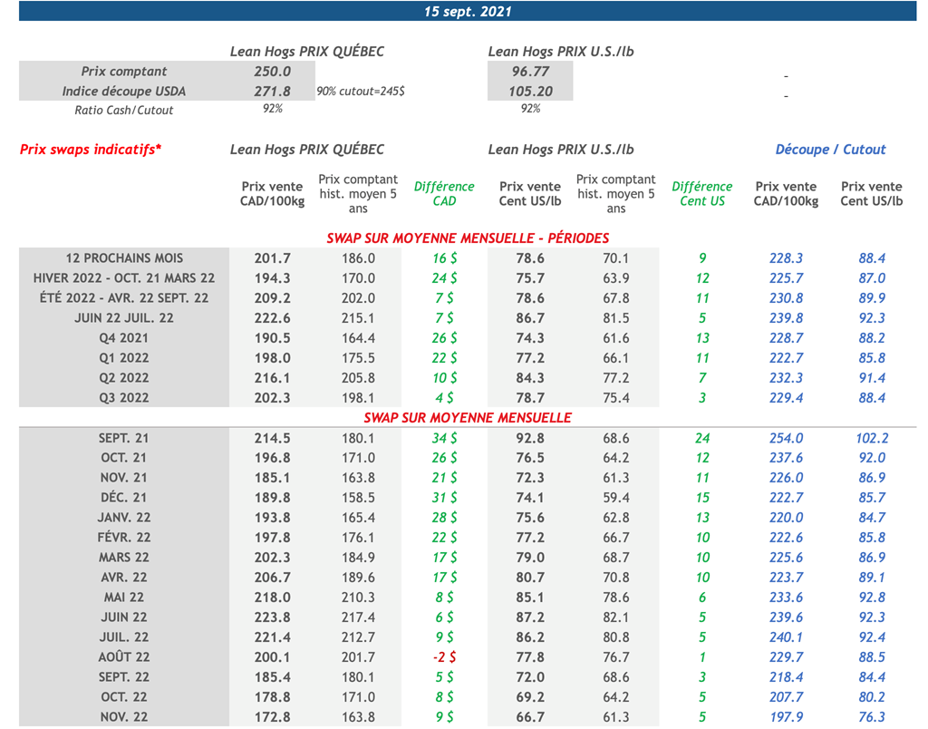 • Presque tous les contrats ont terminé la journée en baisse d'environ 1 cent US/lb hier, sous la pression de la baisse continue de la valeur du porc spot.