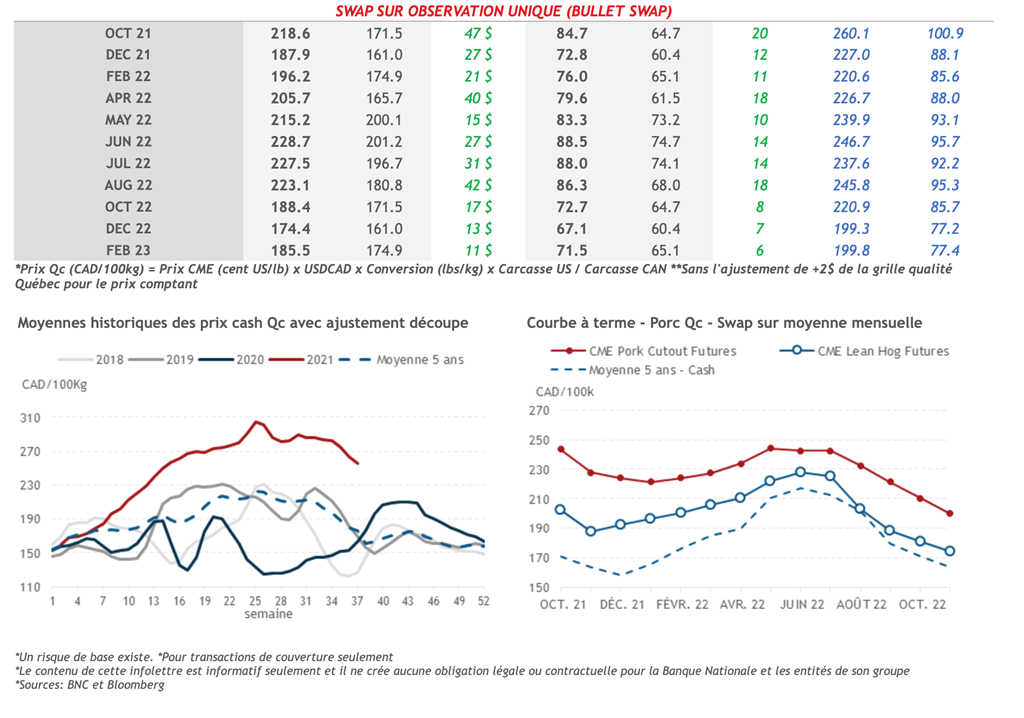 • Les contrats de porc ont tous terminé dans le vert hier. Les gains des contrats de décembre 2021 à octobre 2022 ont tous été supérieurs à 2 cents US/lb. Le contrat d’octobre 2021 a fait un gain de 3,20 cents US/lb hier après s’être apprécié de 1,90 cent US/lb mercredi.