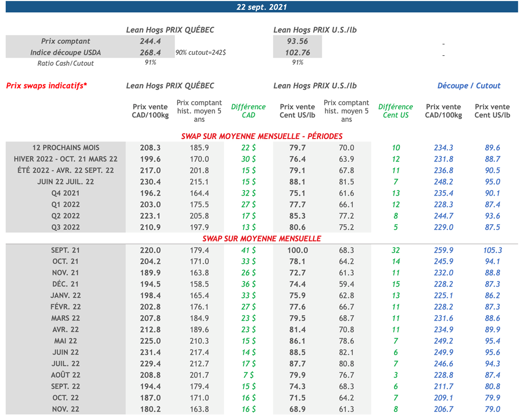 • L’indice de la découpe U.S est demeuré pratiquement inchangé avec une perte de 0,13 cent US/lb. Ce matin, l’indice Cash CME se situe à 93.56 cents US/lb (-0,48).