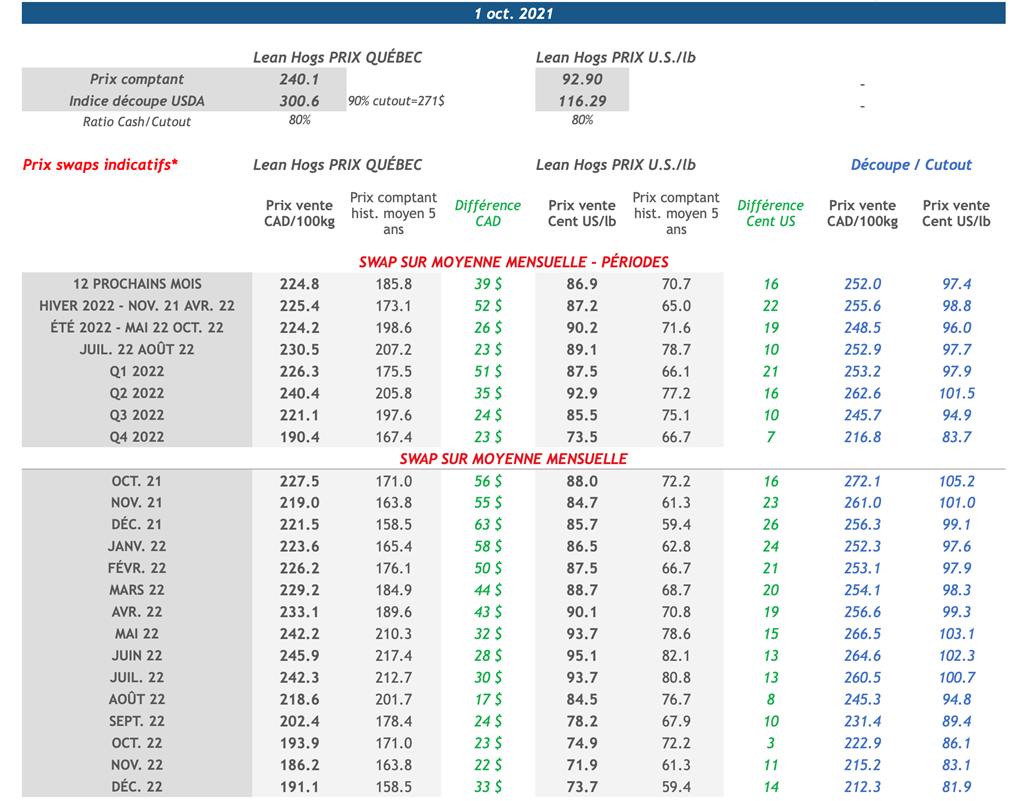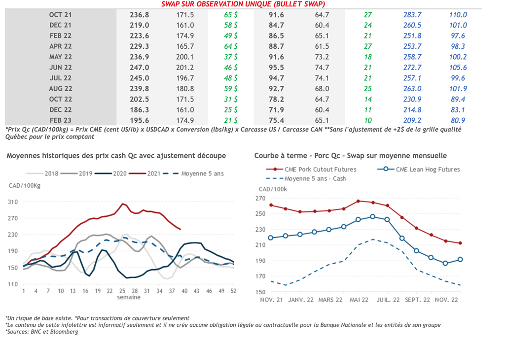 • Tous les contrats de porcs sur le CME étaient dans le vert, hier. À titre indicatif, le contrat de Déc-.21 et Fév.-22 sont ceux qui se sont le plus appréciés, avec des gains de 1,800 et 1,450 cents US/lb, respectivement.