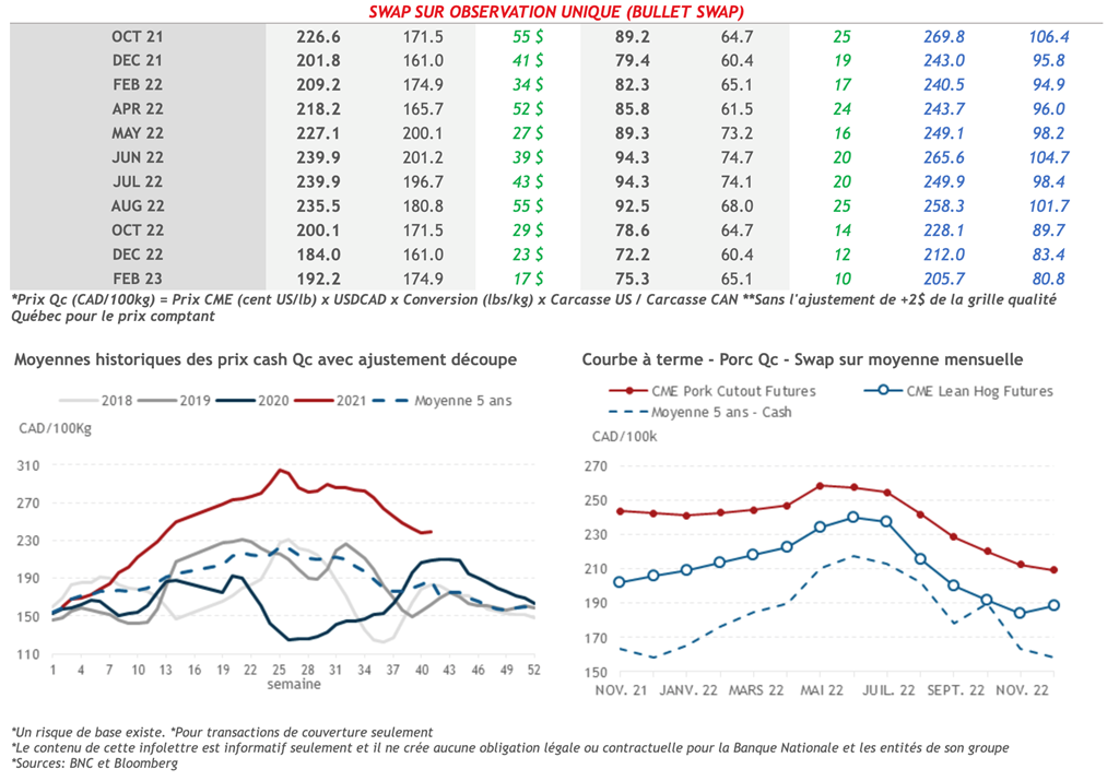 • Les contrats de porc étaient en baisse hier jusqu'au mois d'octobre 2022. Comme attendu, l'indice de découpe de porc U.S. est remonté à 108,01 cents US/lb, un gain de 1,02 cents US/lb. Ce matin, l'indice CME Cash de porc baisse toujours à 91,60 cents US/lb (-0,35).