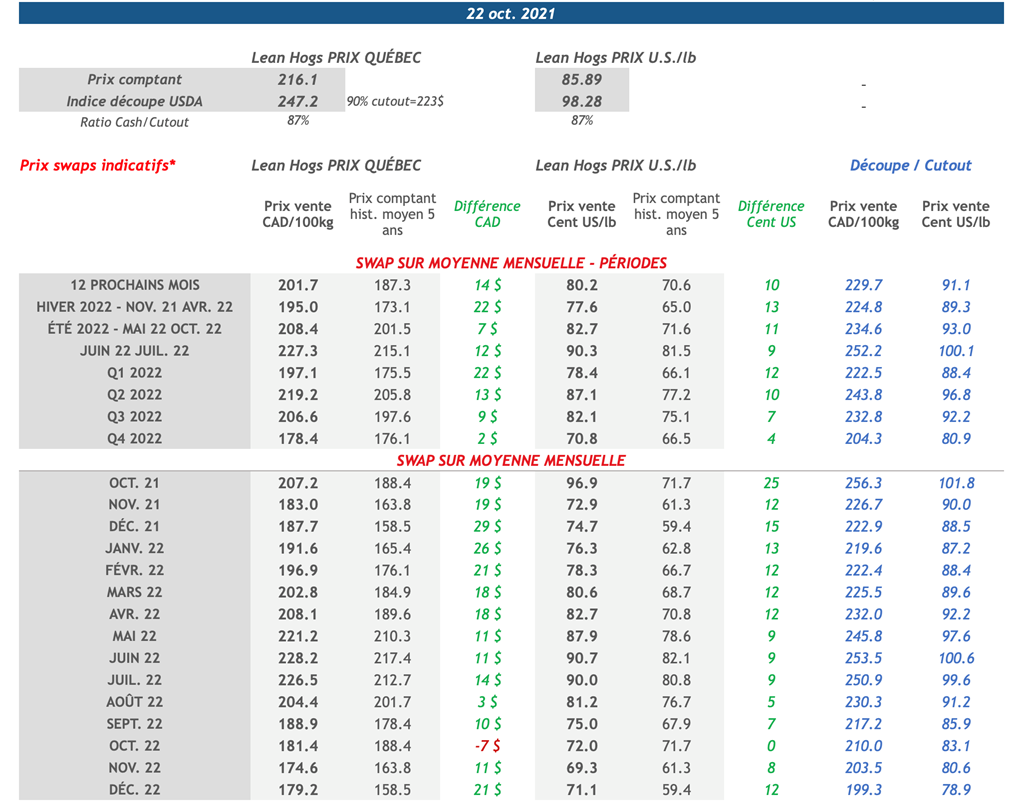 • À l’inverse, l’indice de découpe U.S a fait un gain de 1,41 cents US/lb et se situe à 98,28 cents US/lb, un niveau très similaire à celui de l’année dernière. Malgré ce gain, le flanc a tout de même perdu 12,24 cents US/lb. Ce matin, l’indice Cash CME se situe à 84,83 cents US/lb (-1,06).