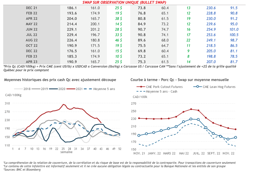 • L’indice de la découpe de porc a terminé la semaine dernière pratiquement inchangé à 98,27 cents US/lb. Ce matin, l’indice de porc au comptant CME se situe à 83,70 cents US/lb (-1,13).