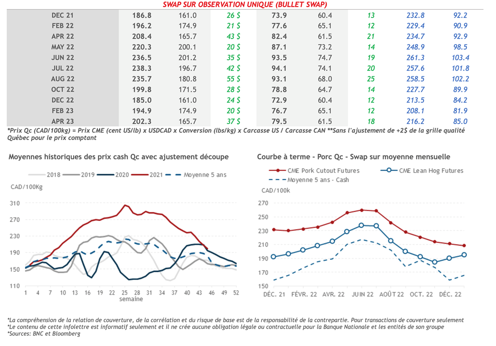 • Pour une troisième journée consécutive, les contrats sur le porc ont connu une journée mixte hier. Tout comme pour vendredi, les contrats à échéance plus rapprochés se sont dépréciés tandis que les contrats à échéance plus éloignés se sont appréciés. Encore une fois, ce fut une journée relativement tranquille pour une majorité des contrats, à l’exception du contrat du premier contrat (Dec-21) qui a chuté de 1,425 cents US/lb.