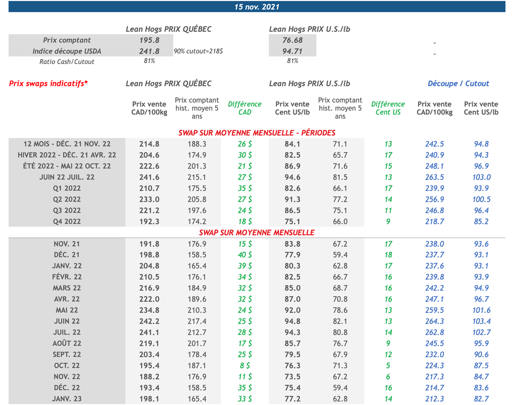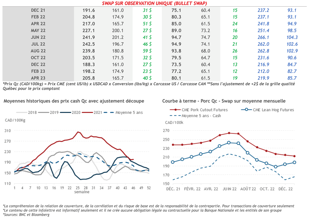 • Vendredi dernier, tous les contrats de porc ont affiché des gains. Les contrats de février, avril et mai 2022 sont ceux qui ce sont le plus appréciés avec des gains de 1,475, 1,400 et 1,250 cents US/lb, respectivement.