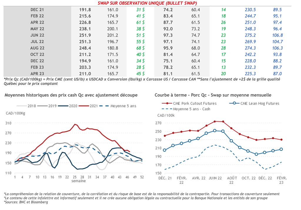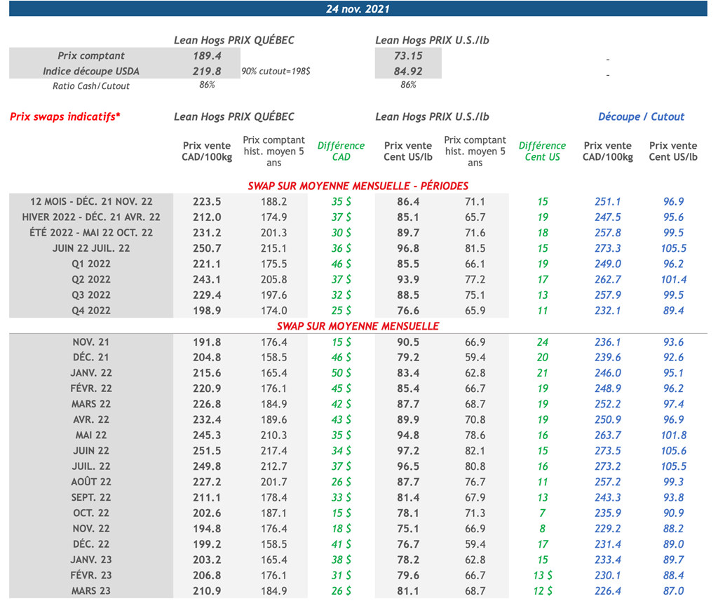 • Les contrats de porcs ont terminé la journée d’hier mixtes, malgré une majorité dans le vert. Les mouvements sont restés plutôt faibles en amplitude, le contrat de décembre 2021 étant le plus déprécié avec une perte de 0,50 cent US/lb, pour atteindre 74,15 cents US/lb.