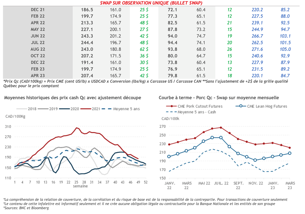 • L’indice de découpe de porc américaine n’était pas de la partie, enregistrant une perte de 3,48 cents US/lb, s’établissant à 86,96 cents US/lb. Le jambon continue de peser sur la valeur de la découpe, avec une perte de 15,42 cents US/lb. Ce matin, l’indice au comptant du porc CME se situe à 70,83 cents US/lb.