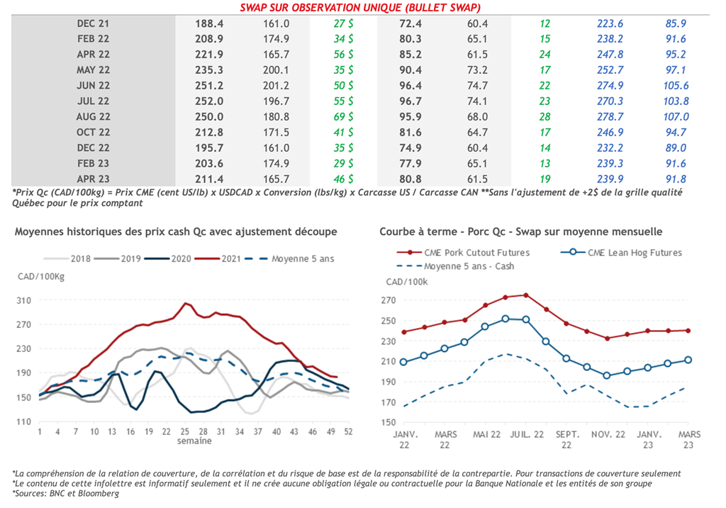 • À l’inverse, l’indice de découpe de porc américain a enregistré une faible perte de 0,77 cent US/lb et se situe maintenant à 86,19 cents US/lb. La longe a perdu 9,80 cents US/lb, et c’est ce qui a fait pression à la baisse sur la valeur de la découpe. Ce matin, l’indice au comptant s’est établi à 71,58 cents US/lb (+0,63).