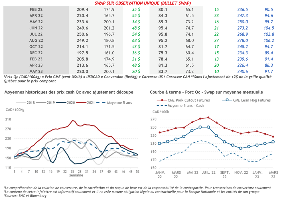• L’indice de la découpe de porc américain était également de la partie, avec une hausse de 3,66 cents US/lb et se situe maintenant à 91,49 cents US/lb. Différemment à ce que nous avons vu cette semaine, ce n’est pas la longe qui est responsable de ce mouvement, mais bien le jambon qui a gagné 10,04 cents US/lb. Ce matin, l’indice au comptant du porc se situe à 72,41 cents US/lb.