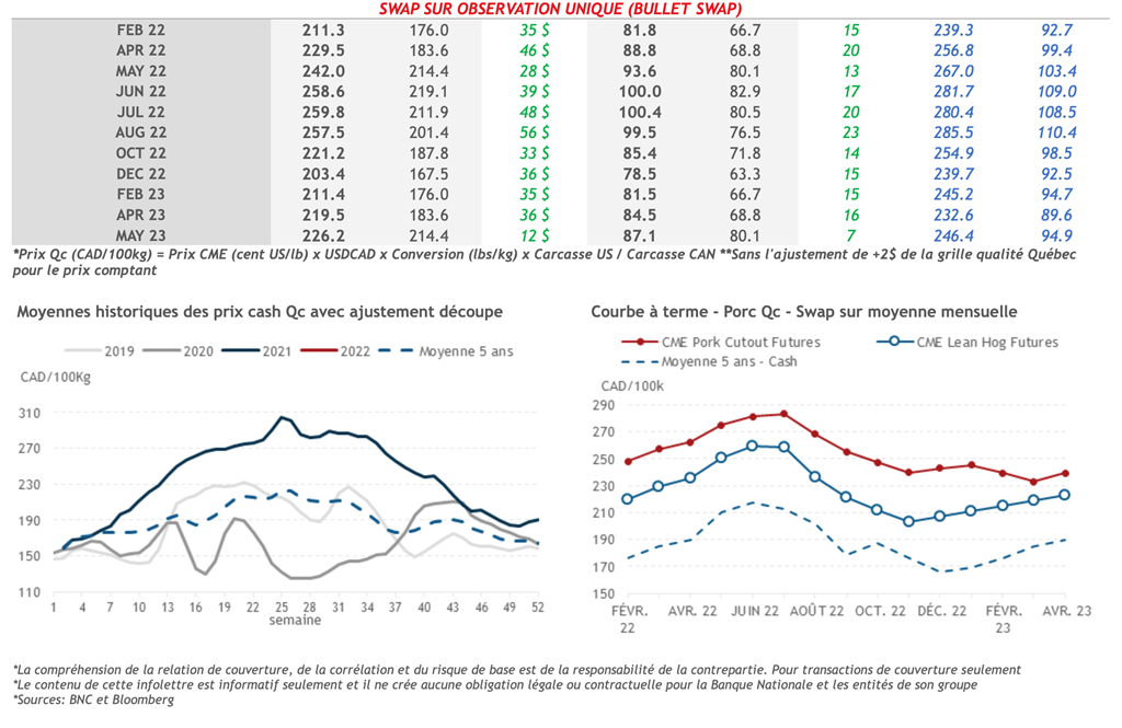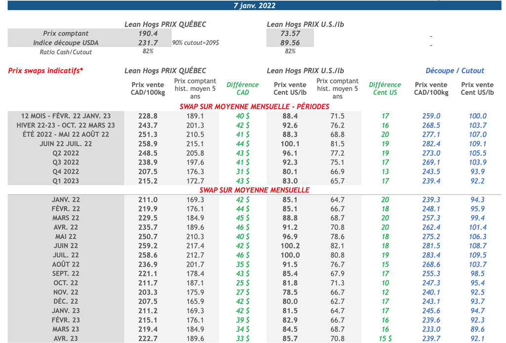 • L’indice de découpe de porc américaine a suivi cette même tendance à la hausse et s’est appréciée de 3,64 cents US/lb et a conclu la journée à 89,56 cents US/lb. Malgré la baisse de 14,70 cents US/lb du rôti d’épaule, la hausse de la longe et du jambon a su faire pencher la balance dans le vert. Ce matin, l’indice au comptant du porc se situe à 73,57 cents US/lb.