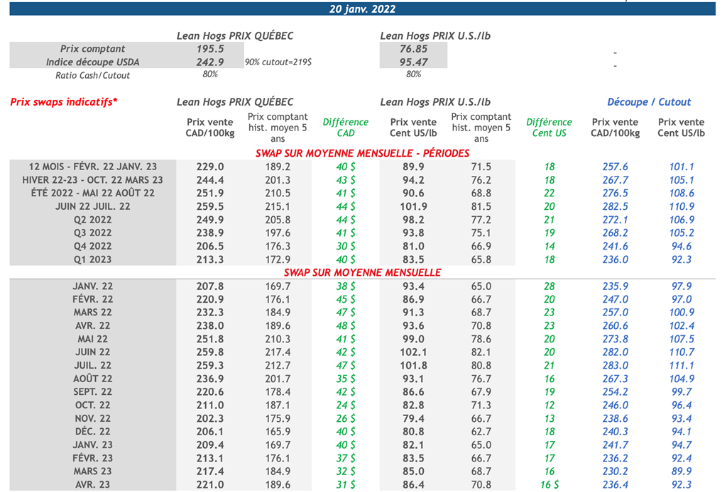 • L’ensemble des contrats sur le porc ont terminé la journée d’hier dans le vert. Le contrat actif (avril 2022) a fait un gain significatif de 2,075 cents US/lb et a conclu la journée à 91,350 cents US/lb.