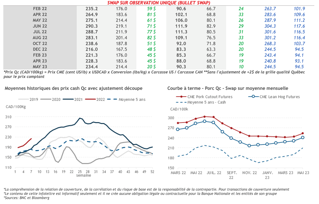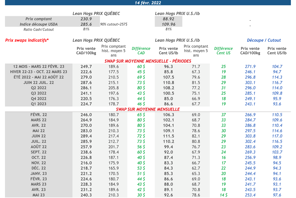 • L’indice de la découpe de porc U.S. a également terminé à la hausse, propulsé par un gain hebdomadaire de 50% du jambon. En date de vendredi, l’indice se situait à 109,96 cents US/lb (+12% sur la semaine). L’indice du porc au comptant a grimpé à 87,74 cents US/lb vendredi (+4,08% sur la semaine) et poursuit la tendance ce matin à 88,92 cents US/lb.