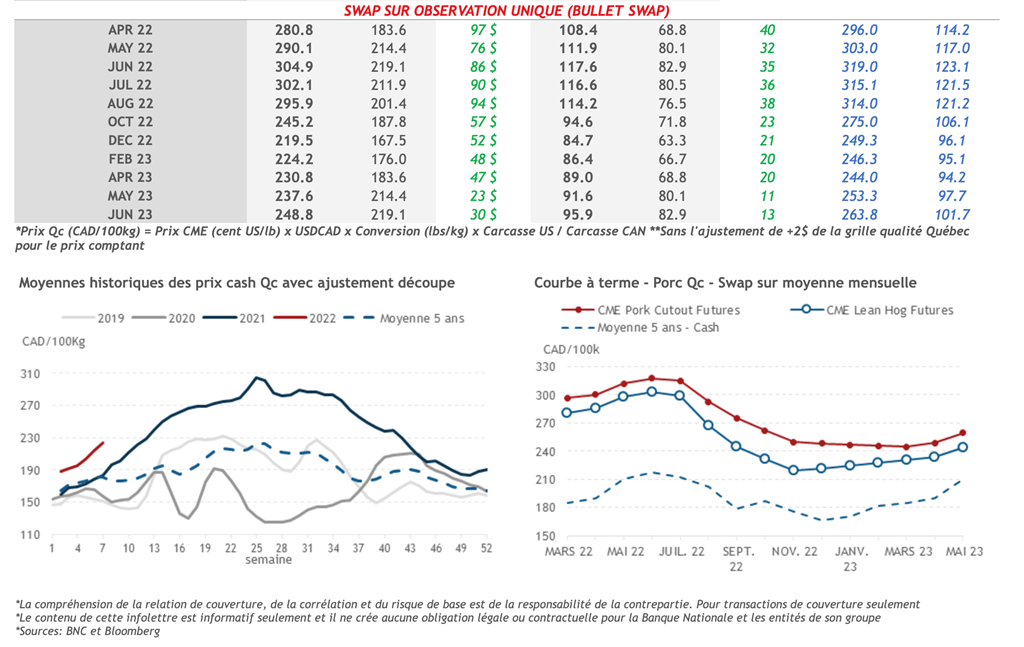 • Tout comme mercredi, les contrats à terme sur le porc ont tous fait des gains hier. Le contrat de juin 2022 fut le plus appréciatif avec un gain de 2,225 cents US/lb, pour s’établir à 117,175 cents US/lb, tandis que le contrat actif (avril 2022) a fait un gain de 2,175 cents US/lb et s’est établi à 107,575 cents US/lb.