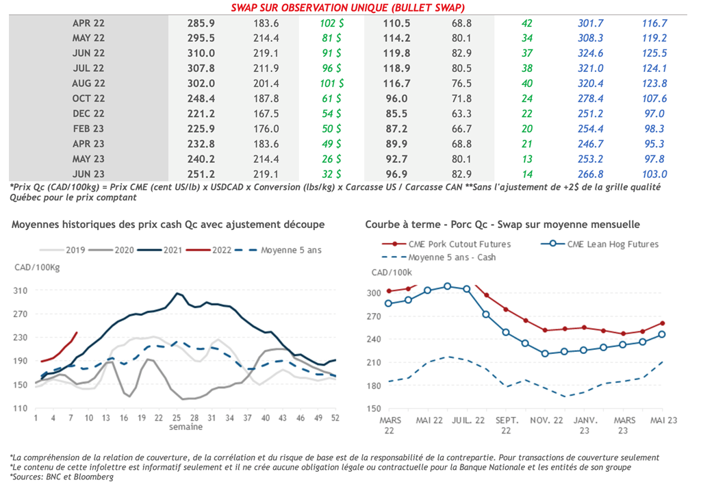 • L’indice de la découpe de porc U.S était quant à lui à la baisse, -1,33 cent US/lb pour être précis, et a terminé la journée à 108,76 cents US/lb. Cette baisse peut être attribuée au flanc et au picnic qui se sont dépréciés de 4,57 et 6,20 cents US/lb, respectivement. Ce matin, l’indice du porc au comptant se situe à 95,23 cents US/lb.
