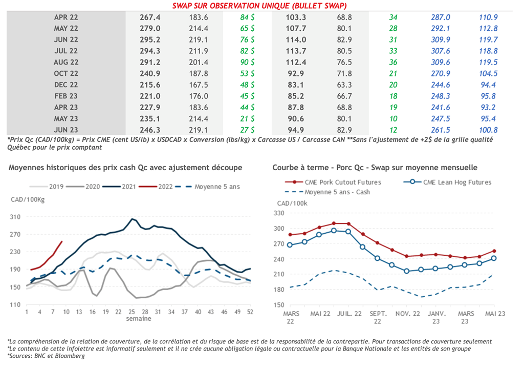 • Selon les estimations de l’USDA, la production de porc de la semaine dernière a augmenté de 0,3% à 548 millions de livres et le rythme d’abattage a également augmenté de 0,4% à 2 507 millions de têtes.