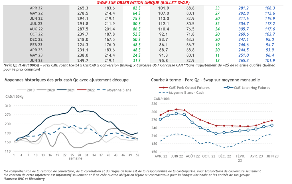 • L’indice de la découpe de porc américain s’est également déprécié, -2,01 cents US/lb et s’est établi à 106,41 cents US/lb. Malgré que le jambon ait gagné 11,92 cents US/lb, c’est la perte de 33,25 cents US/lb du flanc qui a fait pencher la balance. Ce matin, l’indice du porc au comptant se situe à 99,70 cents US/lb, variant peu depuis quelques jours.