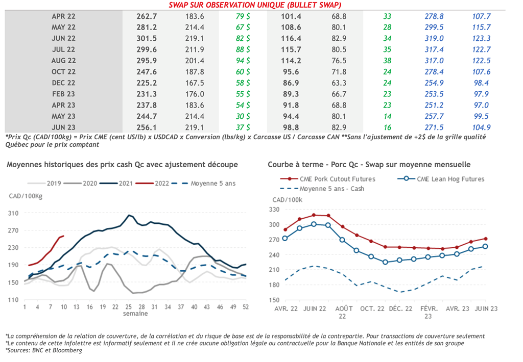 • Hier, tous les contrats à l’exception des deux premiers (mars et avril 2022) ont fait des gains. Les participants du marché restent nerveux quant à la demande de viande de la part des consommateurs compte tenu du prix élevé des denrées alimentaires. Le contrat actif (juin 2022) a fait un gain de 0,975 cent US/lb et s’est établi à 114.90 cents US/lb. Le contrat d’octobre 2022 a été le plus appréciatif avec un gain de 1,975 cents US/lb.