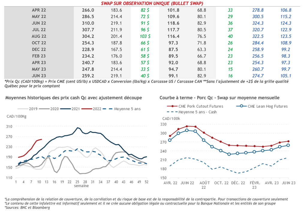 • L’indice de la découpe du porc américain a progressé de 0,640 cent US/lb pour atteindre 103,19 cents US/lb. Malgré une baisse du jambon (-12,48 cents US/lb), les gains du flanc (+11,08 cents US/lb) et de la longe (+6,11 cents US/lb) ont su tirer l’indice à la hausse. Ce matin, l’indice du porc au comptant se situe à 100,76 cents US/lb.