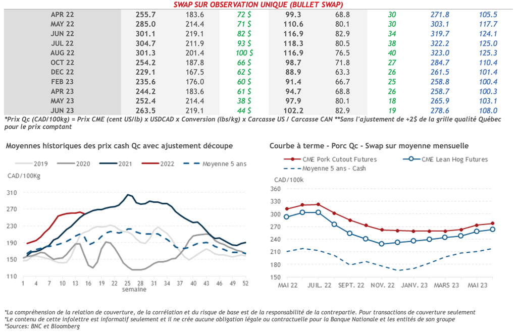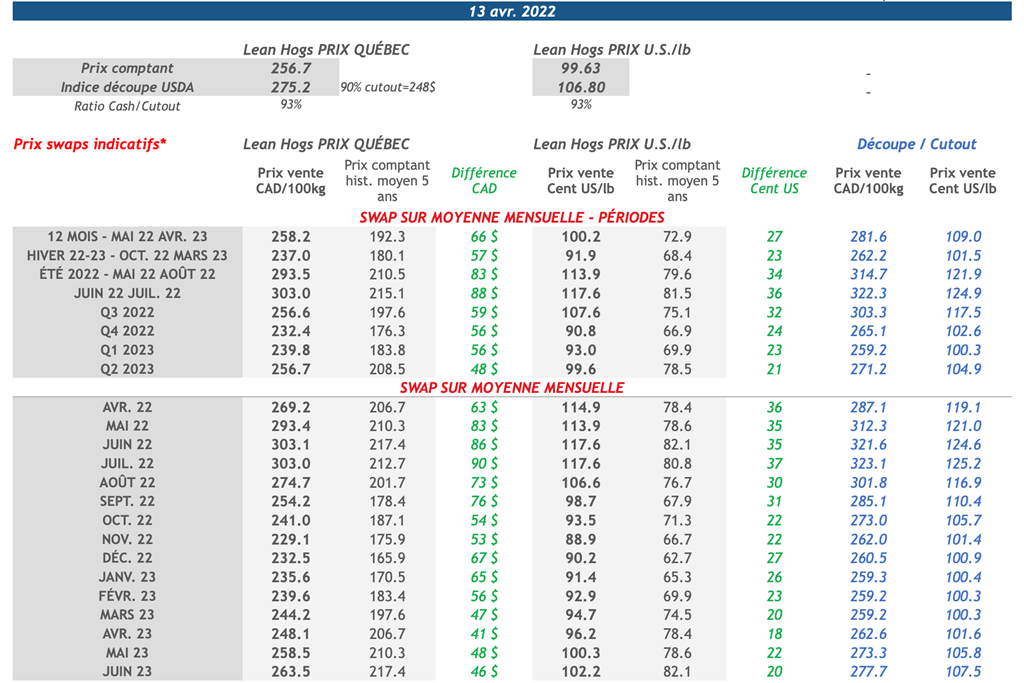 • L’indice de la découpe de porc a terminé à 106,80 cents US/lb, un gain de 0,16 cents US/lb. Le peu de mouvement dans l’indice se justifie par le gain de 7,93 cents US/lb sur le jambon contrebalancé par la perte de 8,37 cents US/lb sur le flanc.