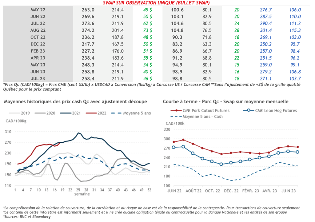 • Une autre journée négative hier sur le marché du porc. Le contrat de mai 2022 a terminé à 99,775 cents US/lb, une diminution de 0,100 cent US/lb. Le contrat actif (juin 2022) était en perte de 2,775 cents US/lb à 102,200 cents US/lb. Le contrat qui a connu la plus forte baisse a été le contrat de juillet 2022 avec une chute de 3,200 cents US/lb, transigeant à 103,850 cents US/lb à la fermeture.