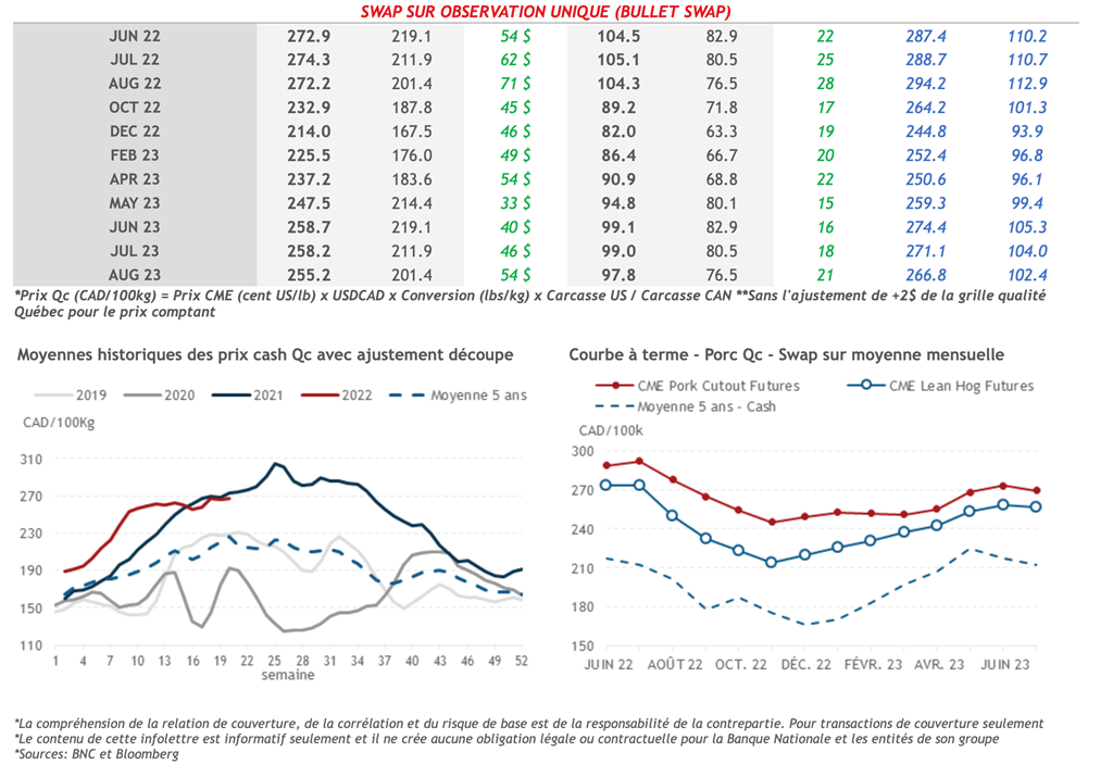 • Le marché du porc a effacé un peu ses gains fait hier après la parution des ventes d’exportations. Les contrats d’été 2022 sont retourné à leurs valeur de mardi à 105.300 cents US/lb pour le contrat de juin 2022, 106.975 cents US/lb pour le contrat de juillet 2022 et 106.125 cents US/lb pour août 2022.