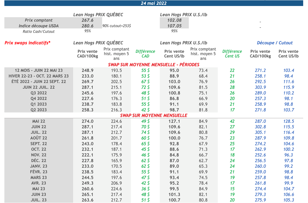 • La semaine dernière, tous les contrats de porcs étaient en hausse. Les échéances à court terme ont le plus gagné avec juin 2022 en hausse de 5 cents et juillet-août 2022 en hausse de 3 cents.