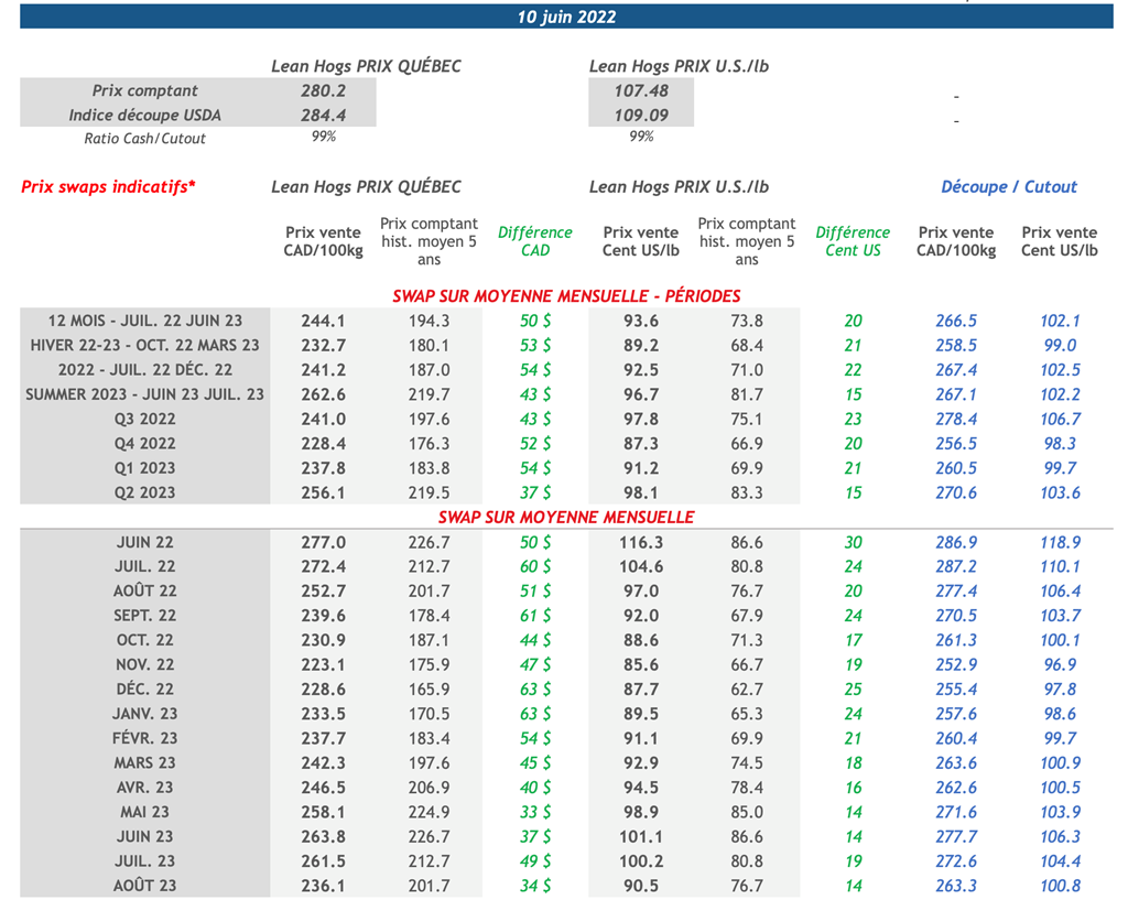• Inversement, l'indice de découpe du porc américain a affiché un gain de 4,62 cents US/lb à 109,09 cents US/lb. Cette hausse a été menée par une augmentation de 17,55 cents US/lb du flanc. Ce matin, l'indice du porc au comptant CME se situe à 107,48 US cent/lb.