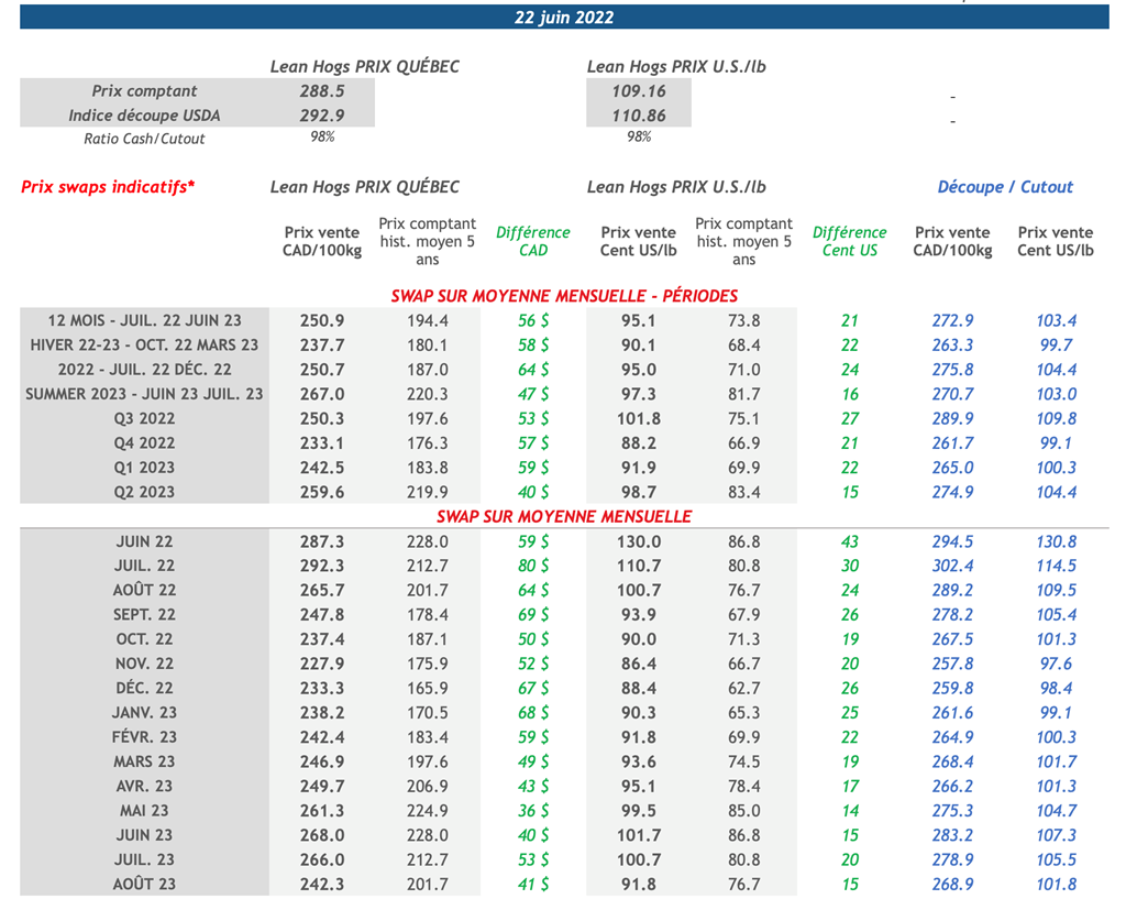 • Hier, les prix des contrats de porc de juillet ont clôturés à 112,725 cents US/lb, le plus haut niveau depuis le 28 avril. Une amélioration des fondamentaux du marché au comptant et un temps chaud dans le Midwest ont contribué à soutenir les prix. Nous avons observé une tendance similaire sur les contrats d'août qui ont terminé en hausse de 1,925 cents US/lb.